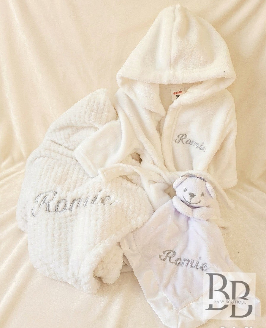 Wrap your little one in love with our adorable personalised baby gift set. This delightful set includes a soft, hooded dressing gown, a cosy blanket, and a cuddly comforter.